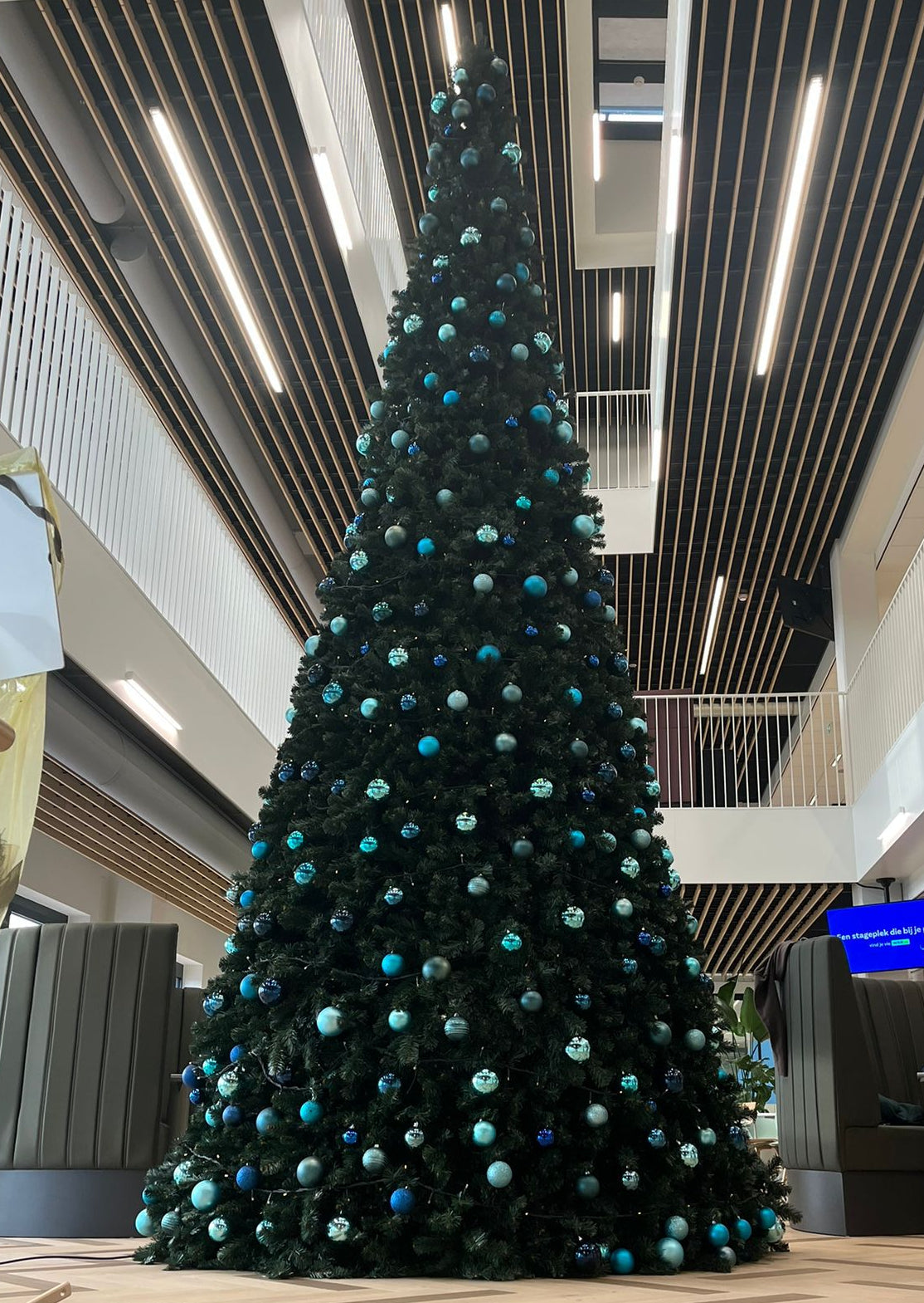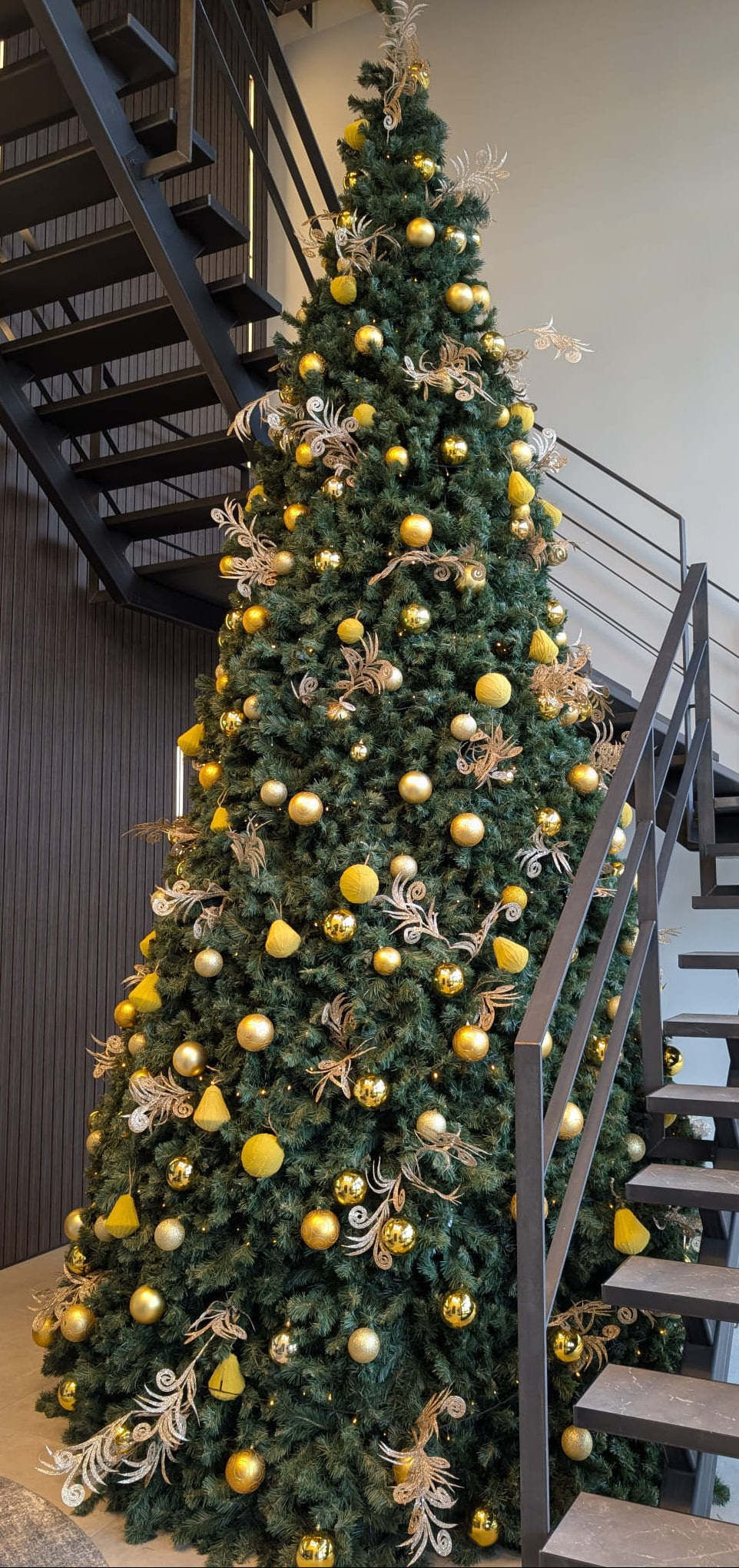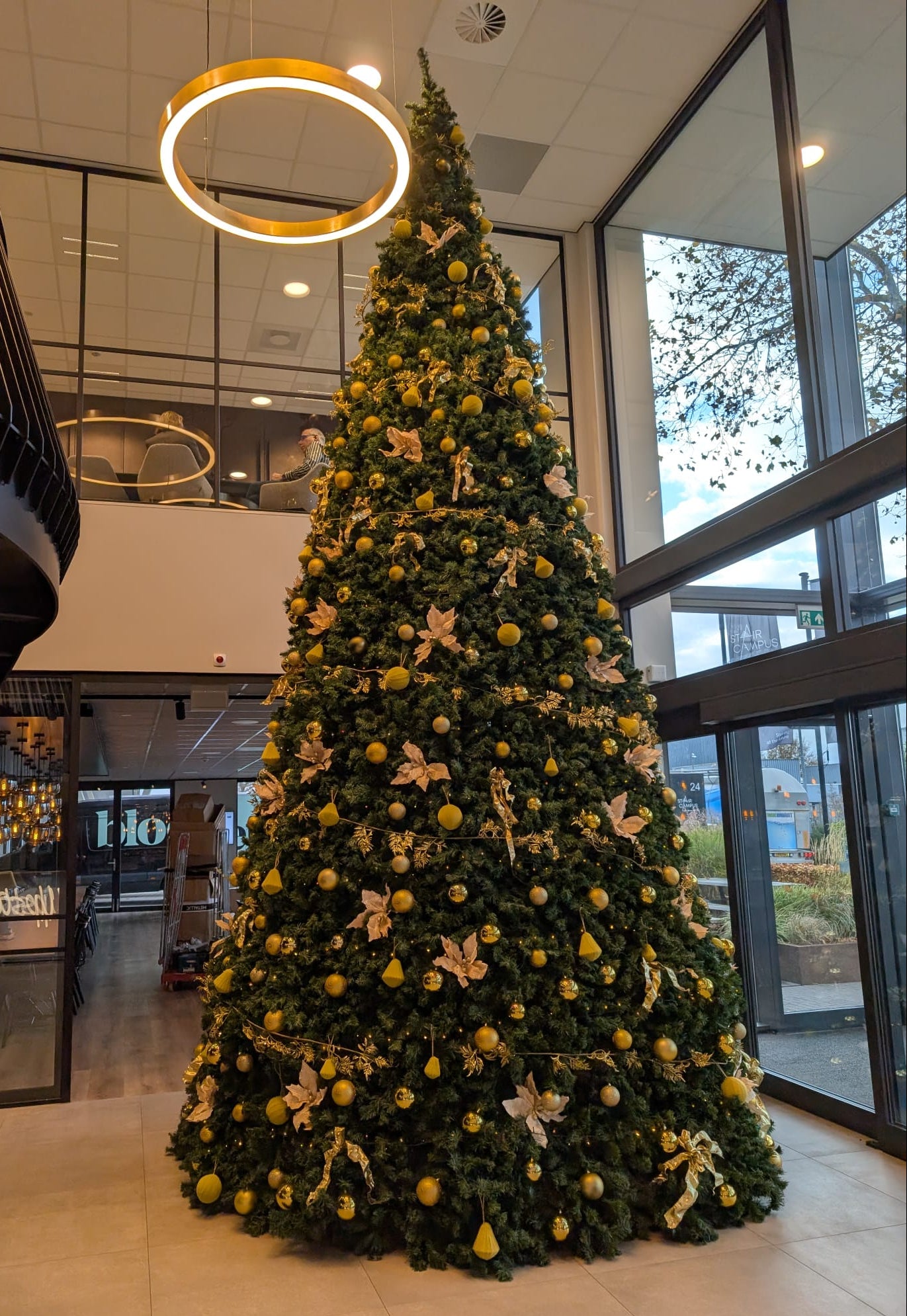 Modern kerstboeket met groen blad en subtiele goudaccenten.