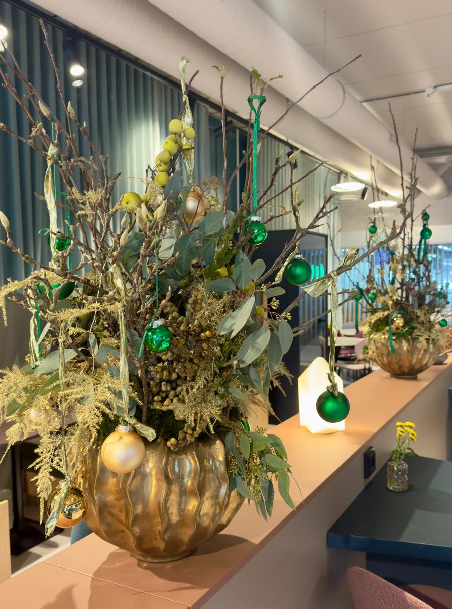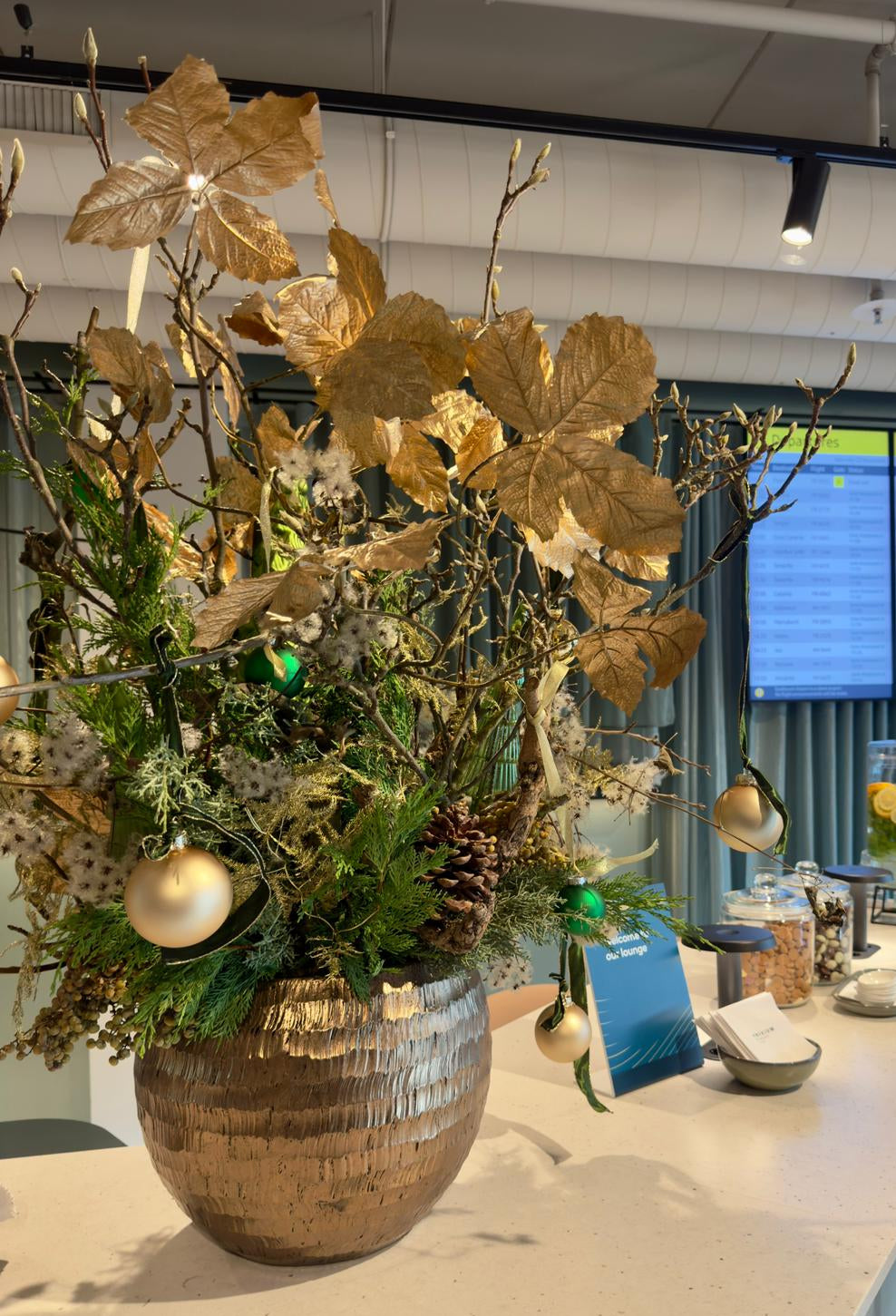Luxe kerstboeket met goudkleurige bladeren en wintergroen voor een stijlvolle uitstraling.