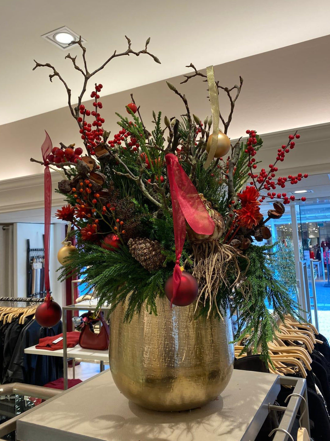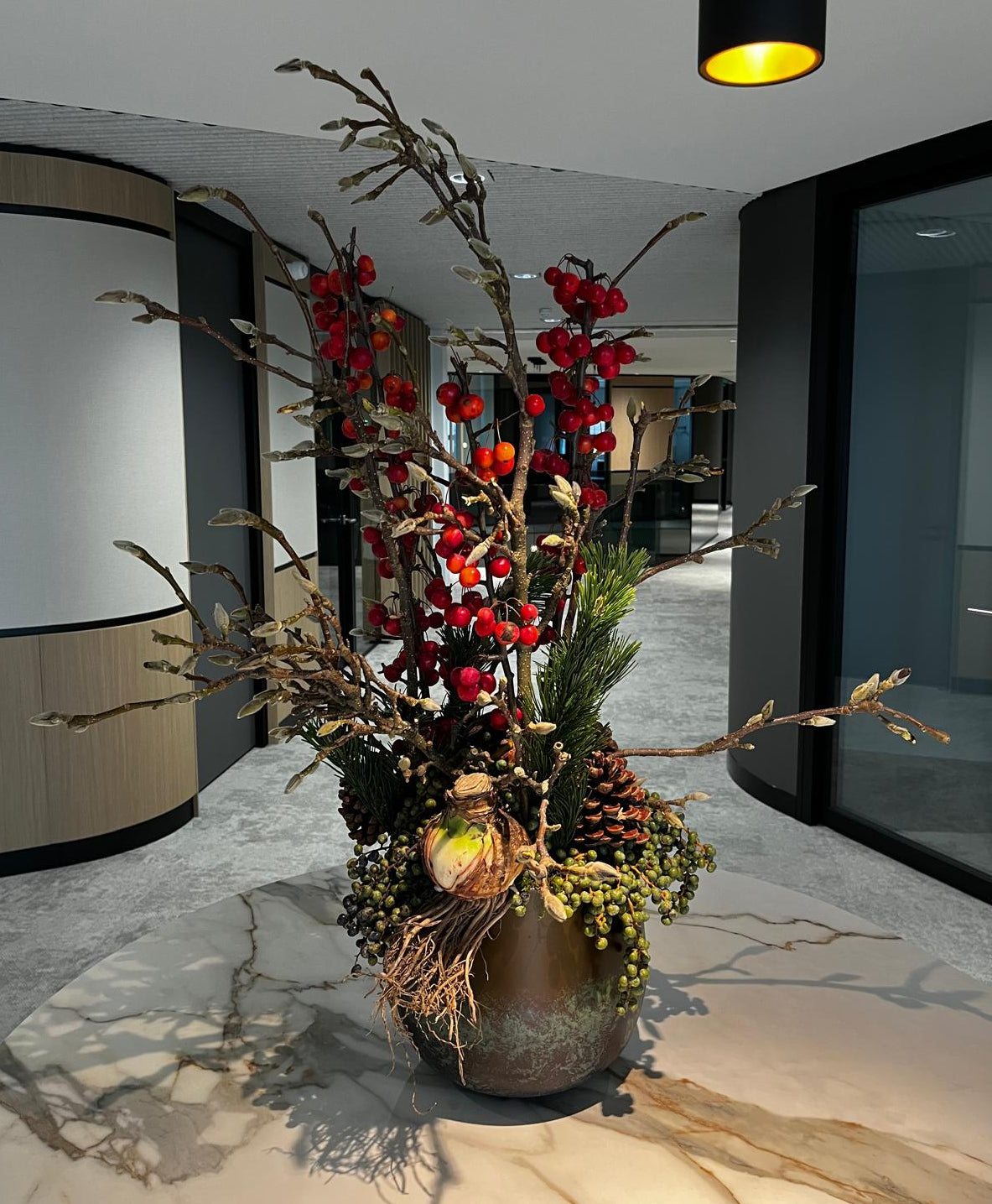 Stoer kerstboeket met rode bessen en takken als echte eyecatcher.
